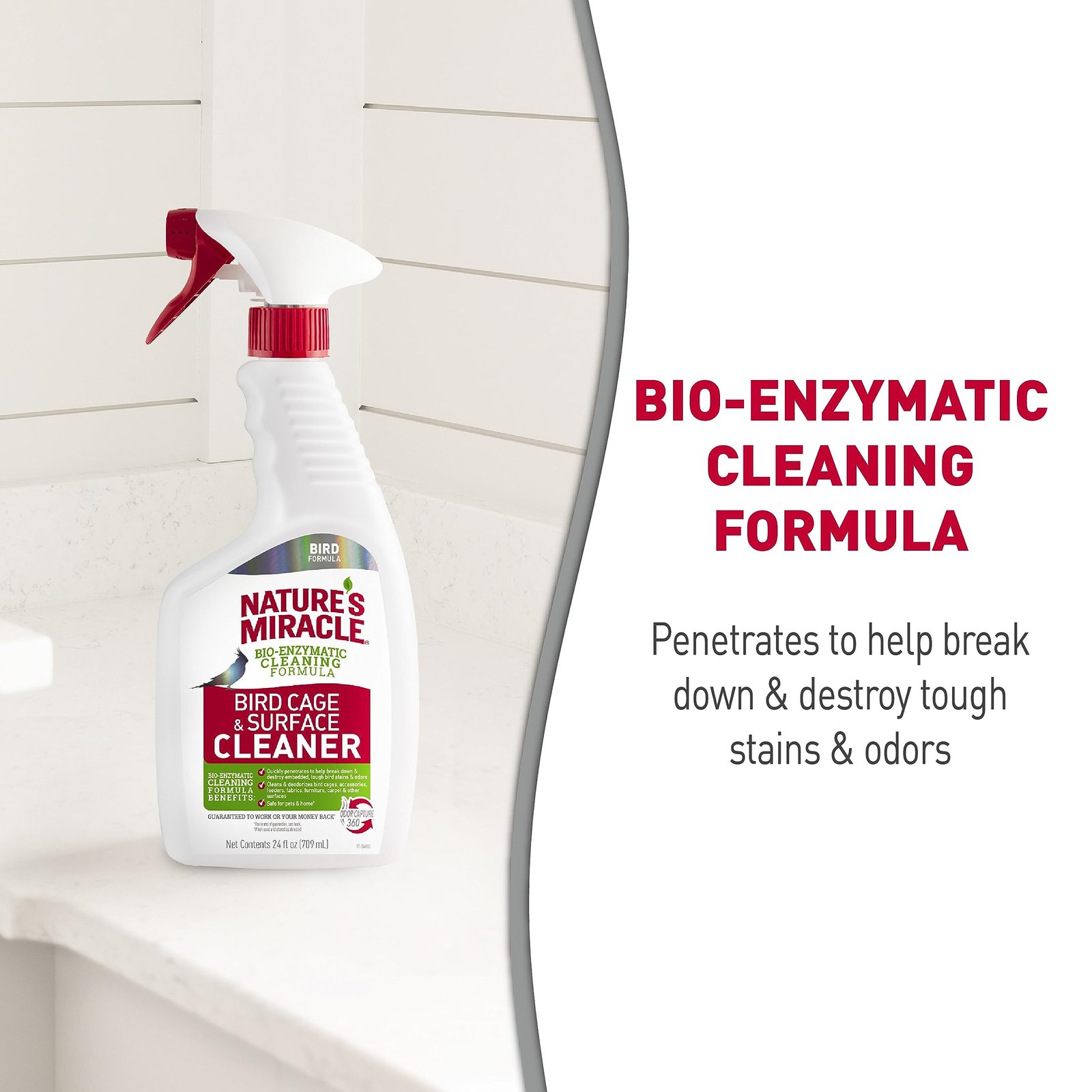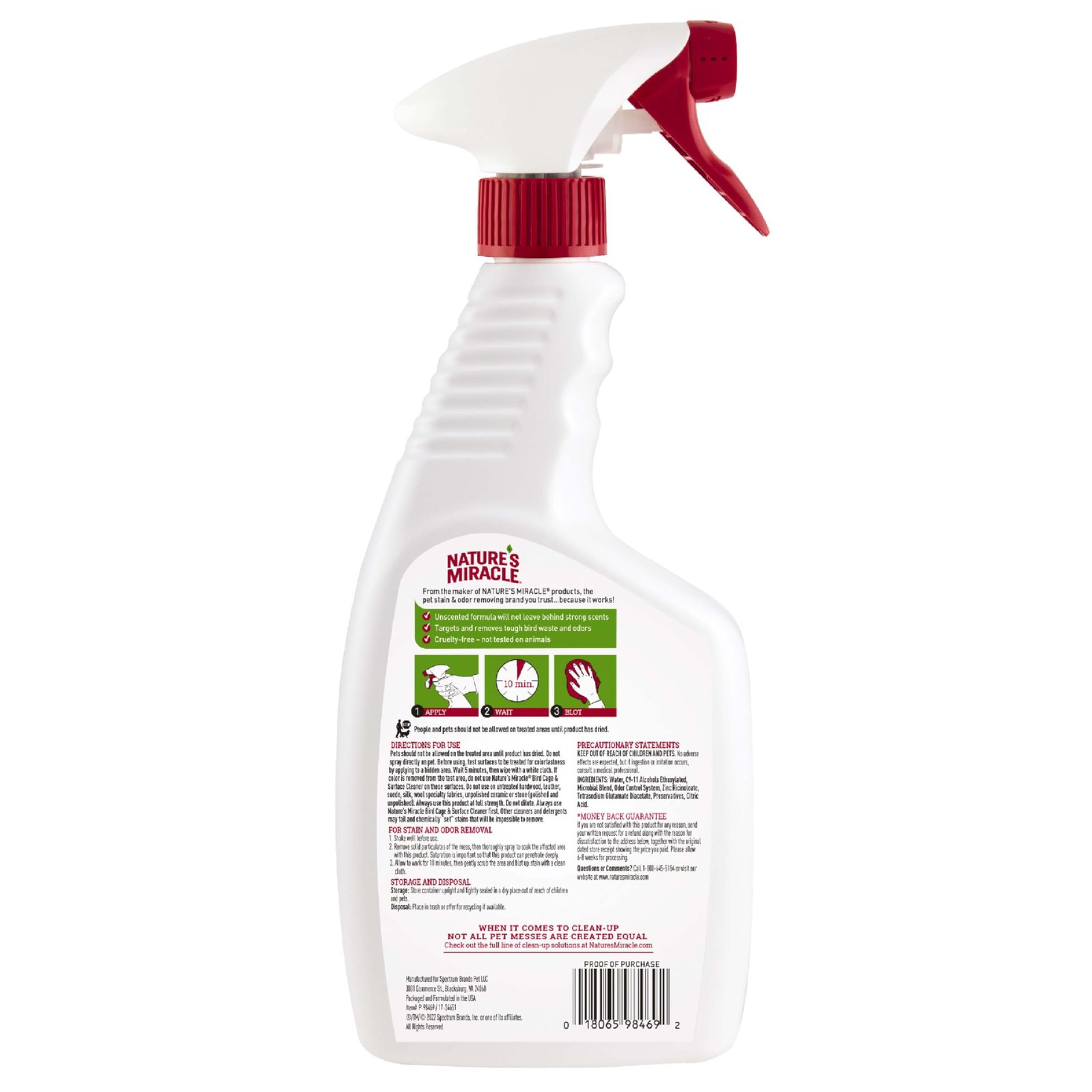 Details: Nature’s Miracle Bird Cage & Surface Cleaner cleans and deodorizes cages. This bio-enzymatic formula penetrates to help break down and destroy embedded, tough stains and odors. With OdorCapture 360 technology, this unscented formula removes odors instead of simply masking them with perfumes. It will not leave behind strong scents that can irritate bird or small animal respiratory systems. Safe for pets and home when used as directed, this formula also cleans and deodorizes accessories, feeders, fabrics, furniture, carpet and other surfaces.