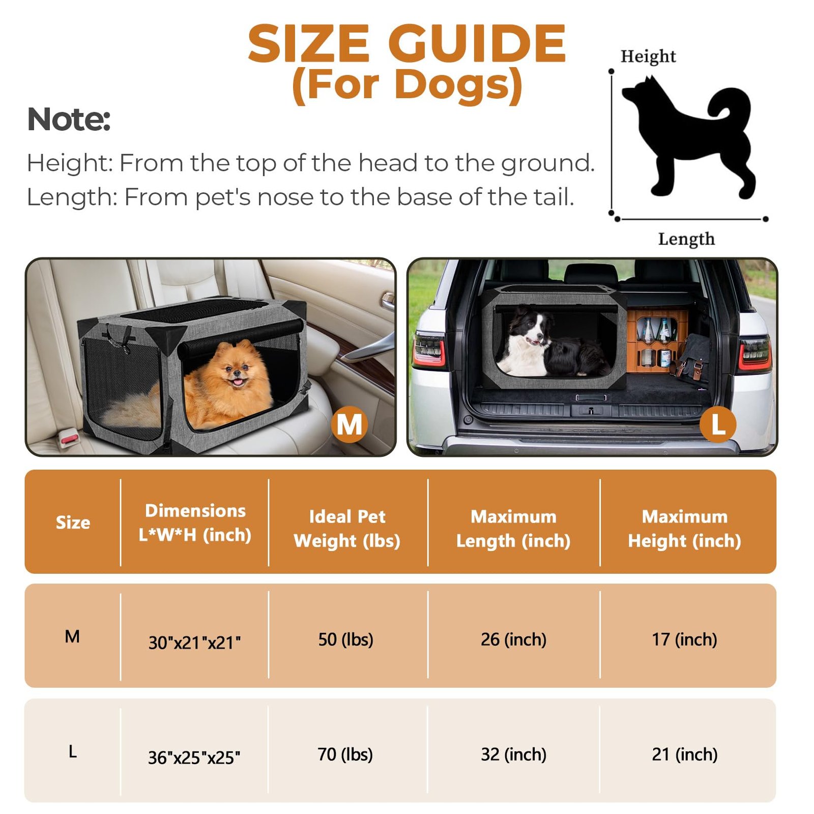 - Travel-Ready & Ultra-Portable – Fits in Your Trunk! “This soft dog crate collapses flat in 60 seconds (folds to 3-inch thick) and weighs only 5.2 lbs – toss this portable dog crate in your car trunk or RV in seconds. Designed for road trips, camping, or hotel stays. Ideal travel dog crate for medium or large dogs up to 70 lbs (36″L x 25″W x 25″H).”