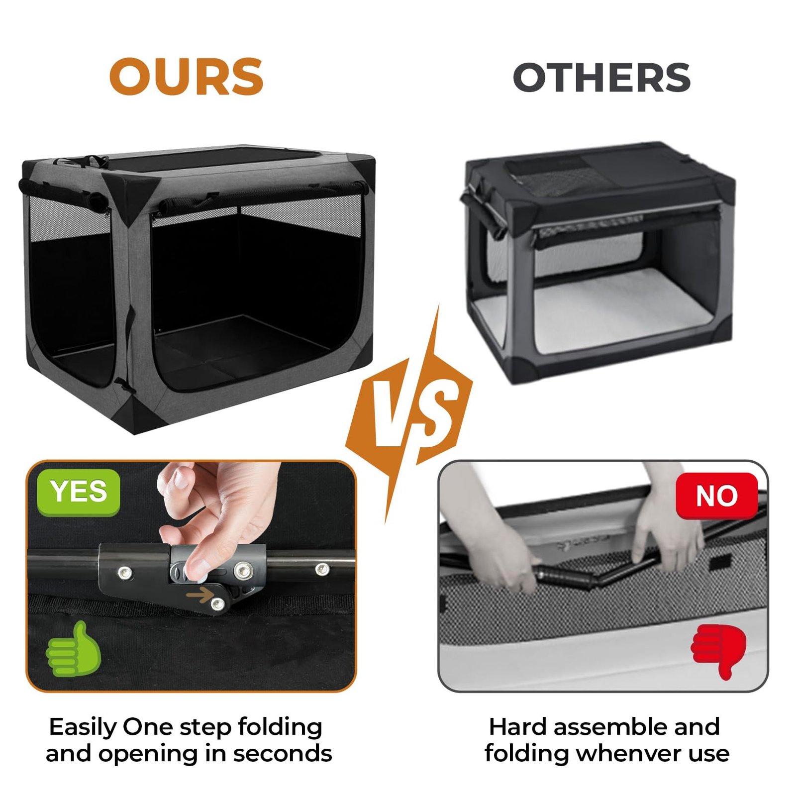 - Only Minutes Setup – Store Anywhere, Clean Everywhere “Assemble this portable dog crate faster than folding a lawn chair – no tools, no hassle. Wipe muddy paws or spills with a damp cloth. The foldable dog crate collapses slim enough to stash under beds or car seats.”