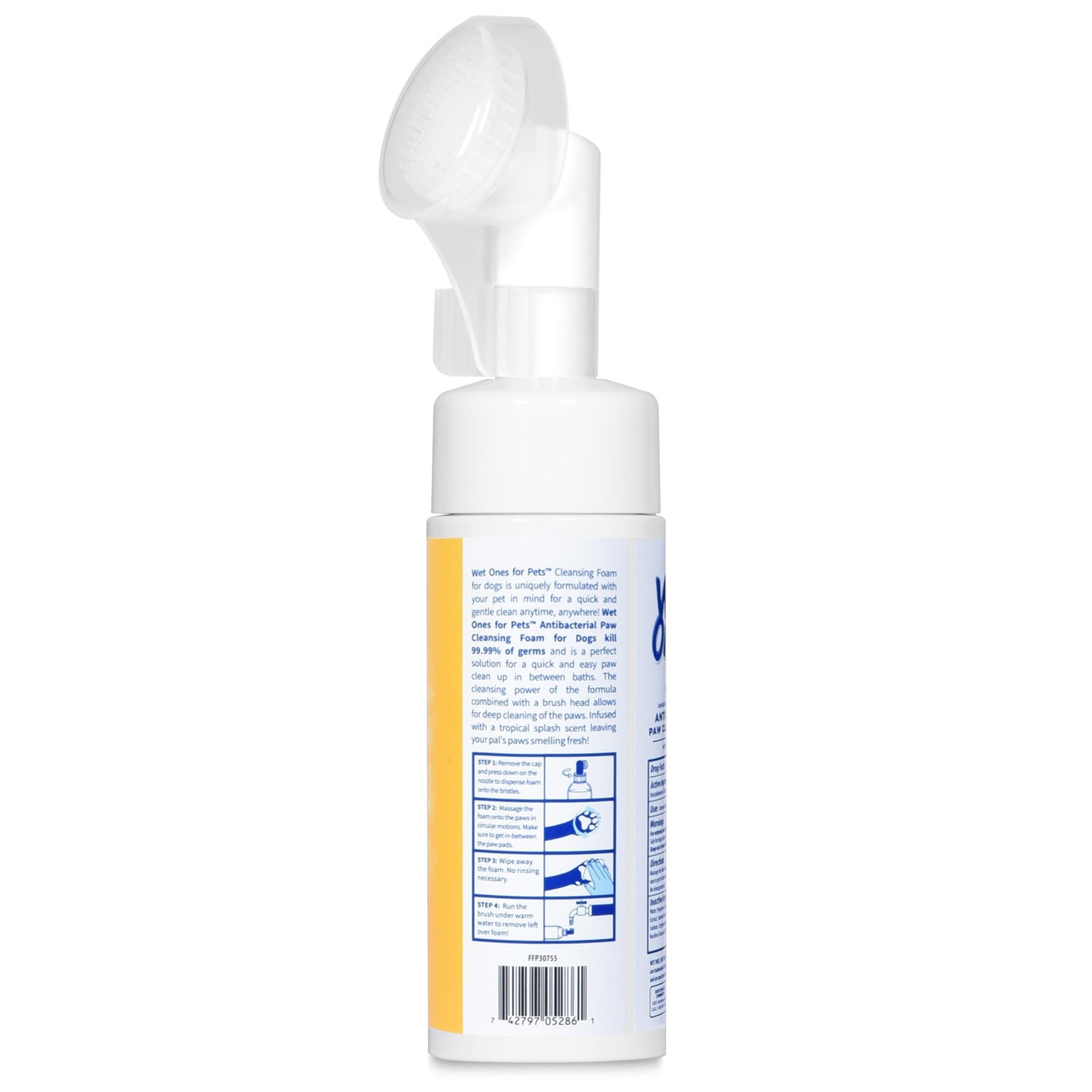 Details: Wet Ones for Pets Antibacterial Dog Paw Cleaner with Built-In Paw Scrubber Brush offers pet parents an easy and effective way to keep their dogs’ paws clean anytime, anywhere. This all-in-one dog paw cleaner uses a foaming cleanser with antibacterial properties, designed specifically for dog paw care. Simply squeeze the bottle to release the antibacterial cleaner into the built-in scrubber, making it a breeze to scrub away dirt, mud, and debris. Your dog’s paws will be left clean and refreshed with a pleasant Tropical Splash scent. This paw cleaner for dogs helps remove dirt from between the toes with its foaming action, making it an essential part of any dog paw care kit. Wet Ones for Pets kills 99.99% of germs, ensuring hygienic dog paw care. The built-in paw washer is perfect for on-the-go dog cleaning supplies. Wet Ones for Pets knows what pet owners need most when it comes to dog cleaning supplies. The easy-to-use design makes this dog paw washer perfect for cleaning up after rainy walks or muddy backyard play. Keep a bottle in your car, at home, or even with your puppy paw scrubber for quick access.